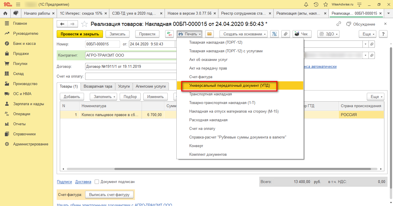 В программе 1С универсальные передаточные документы не имеют собственного отдельного документа. Это связано с тем, что УПД используются в качестве счета-фактуры. Для окончания работы с УПД нужно провести его регистрацию так, как если бы работа велась с привычным счетом-фактурой.