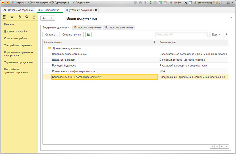 Функциональные возможности системы «1С:Документооборот» в организации процесса контрактации