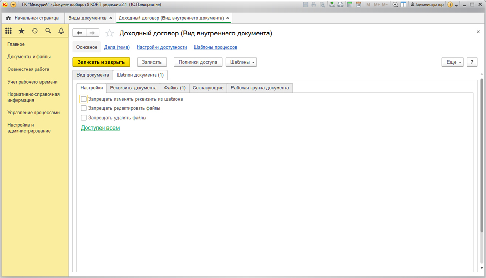 Также нужно определиться, имеет ли смысл делать разграничение прав на уровне всех документов, сопровождающих процесс договорной работы. Таких бумаг, как правило, намного больше, поэтому в случае, если будет принято положительное решение, то сервер 1С будет сильно загружен, что замедлит работу. Но если разграничивать права доступа все-таки необходимо, то следует проставить флажки: