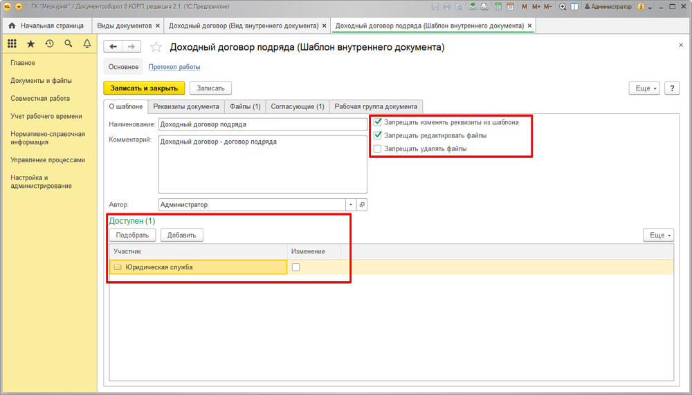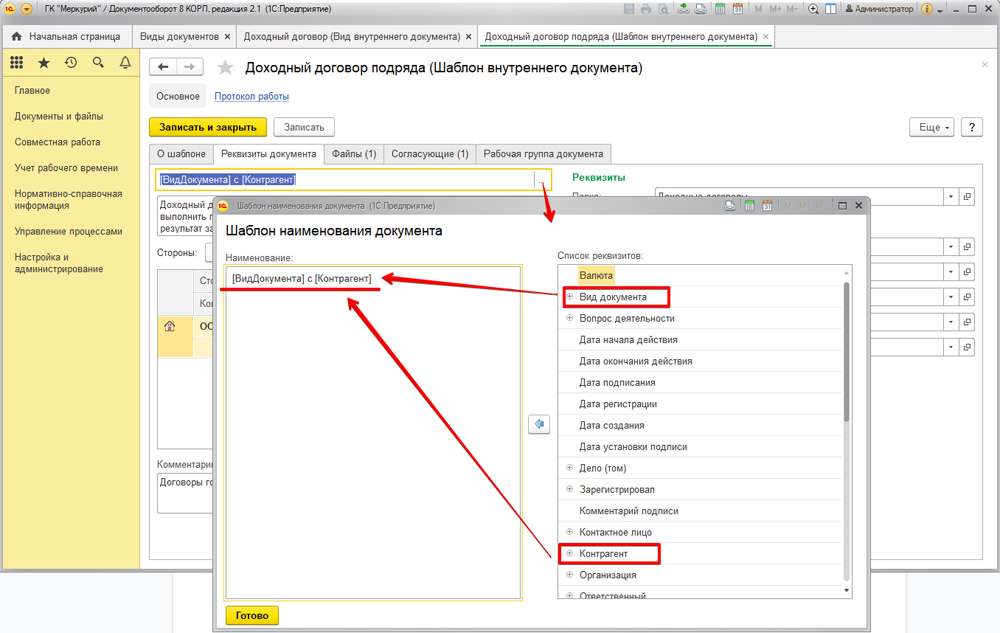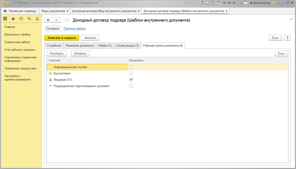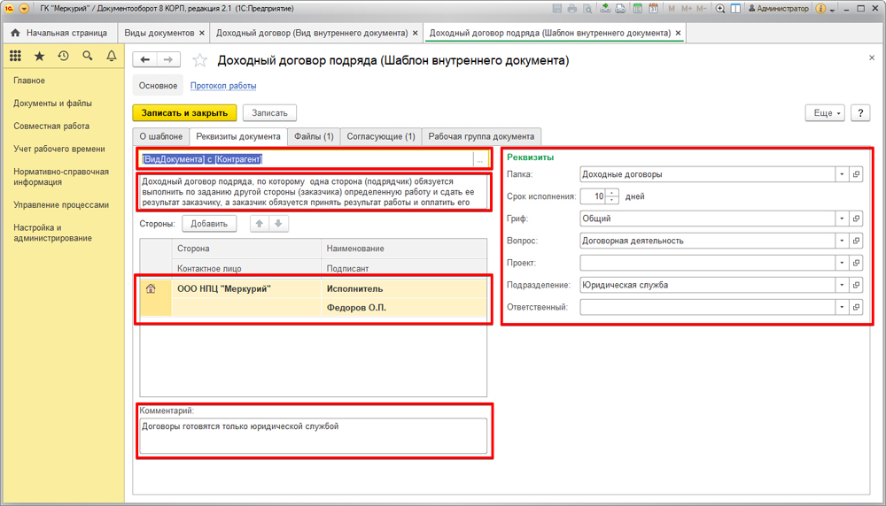 - если указать в шаблоне список лиц, согласующих данный документ, а также перечень лиц, входящих в рабочую группу по данному договору, то это исключит ошибки компетенции (когда договор попадает на подписание непрофильному ответственному специалисту).
