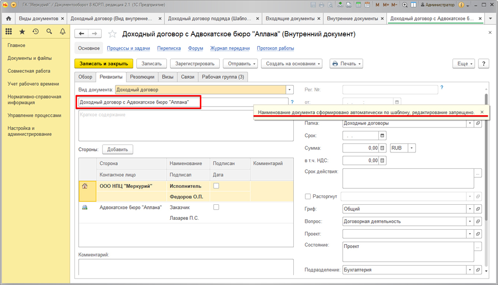 Одной из интересных функциональных особенностей «1С:Документооборот» является то, что в данной системе присутствует конструктор подготовки типовых договоров. В результате человеческий фактор на данном этапе исключается полностью: