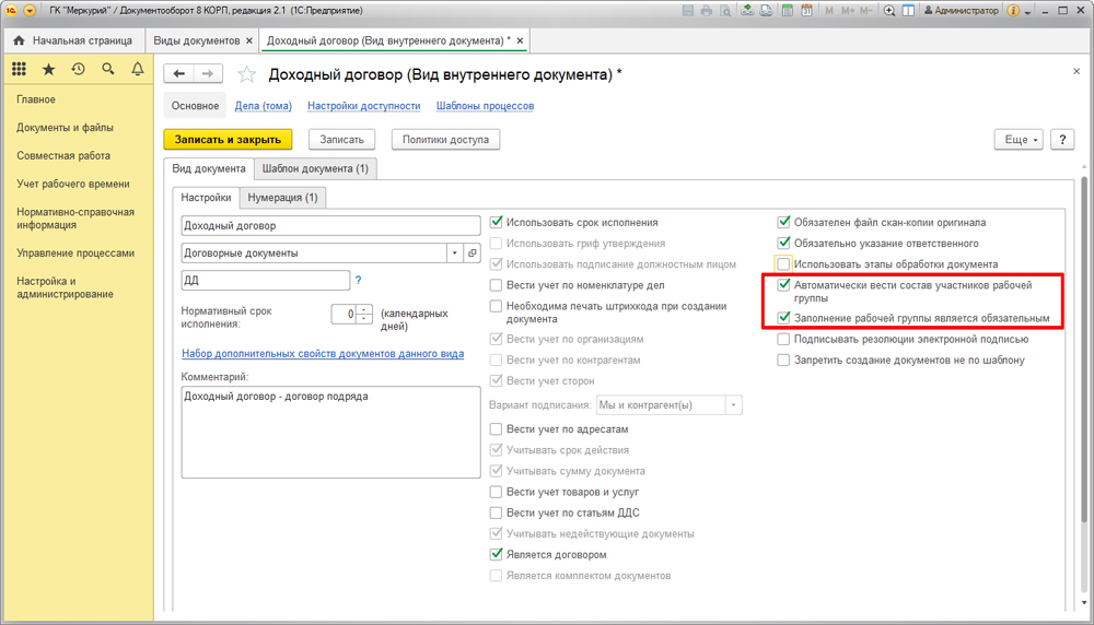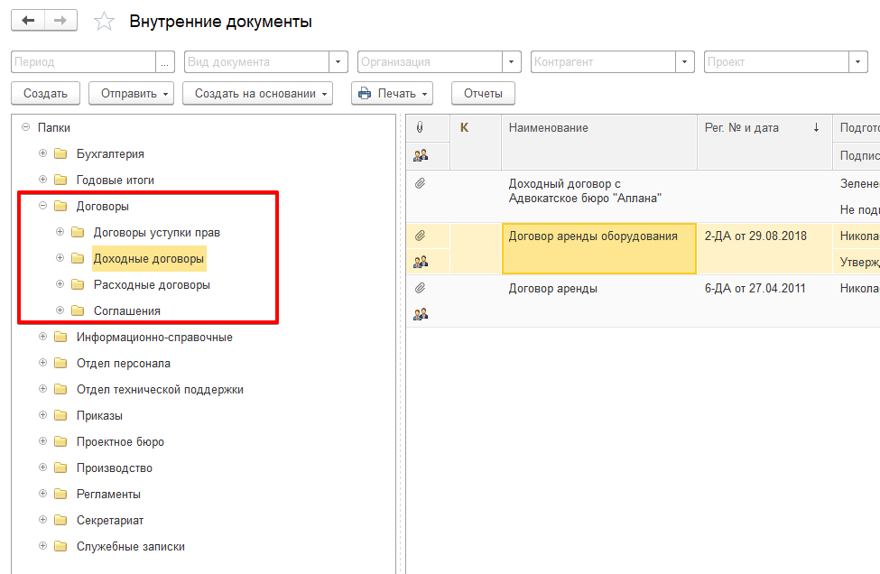 Для того, чтобы документ, который вы хотите поместить в дерево папок с договорами, был соответствующим образом классифицирован, следует указать признак «Является договором».
