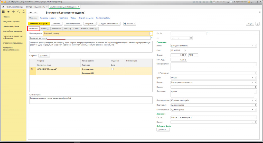 В случае, если вы создаете новый договор, то сначала открывается вкладка «Реквизиты».