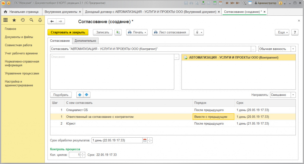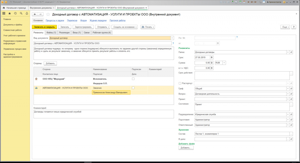 - заполнены все данные о рабочей группе по договору, а также автоматически сформирован перечень лиц, согласующих данный документ.