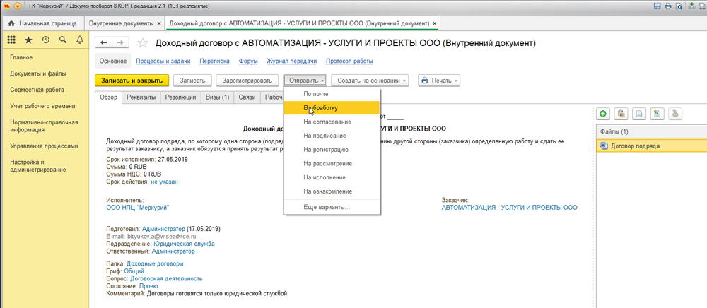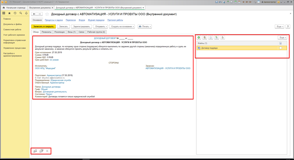 У представляемой системе «1С:Документооборот» присутствует эффективный функционал, дающий возможность использовать процедуры любой сложности для обработки договоров и сопровождающих их документов.