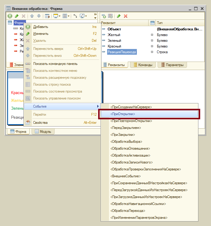 Далее создадим реквизит типа Строка, который назовем Реакция пешехода и также перенесем его на форму. Задача нашей обработки – при вводе определенной комбинации «цветов светофора», выводить в стоке результат – ожидаемое действие пешехода.