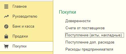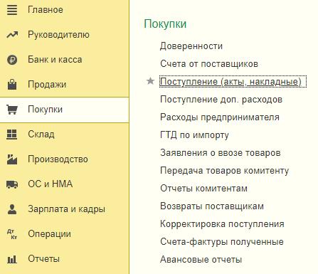 Точно также отражается вклад материалами. Сначала создаем и заполняем уже документ формирования. Затем оформляем «Поступление (акты, накладные)». Для этого входим в «Покупки-Поступление (акты, накладные)».