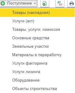 При помощи кнопки «+Поступление» создаем новый документ, в котором выбираем Товары (накладная).