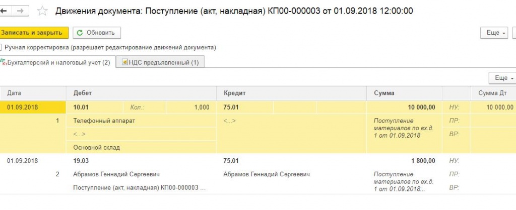 Затем жмем «Провести», и проверяем проводки с помощью кнопки ДтКт.