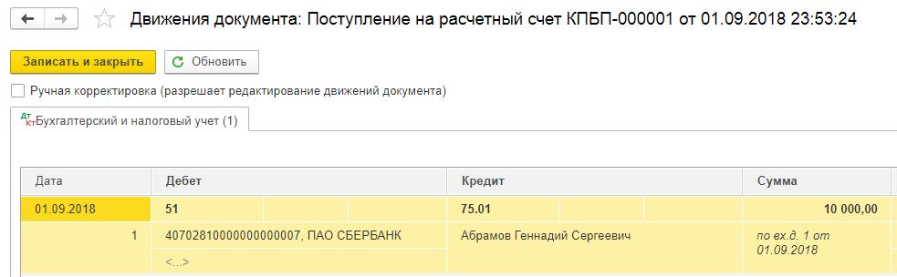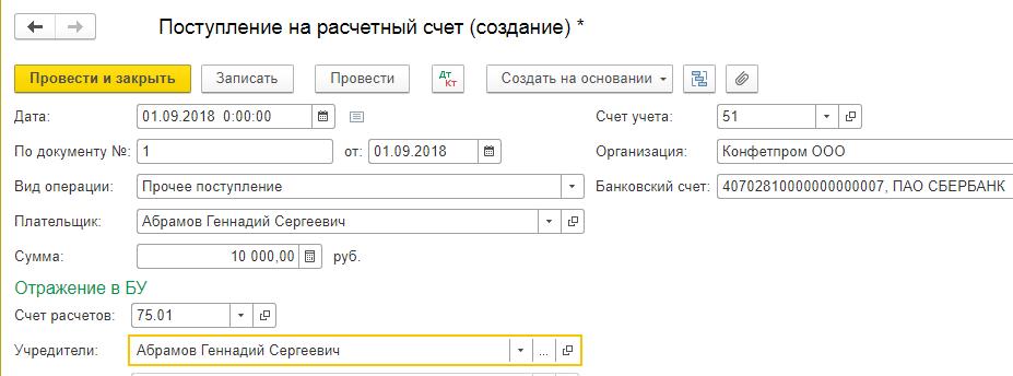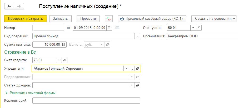 Оформляем документ, при этом в качестве счета учета, указываем 75.01 расчеты по вкладам в уставный капитал.