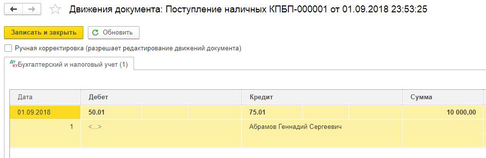 Затем жмем кнопку «Провести» и проверяем проводки, нажав кнопку ДтКт. Нужная проводка проведена, Дт50.01 – Кт75.01. Задолженность по вкладу погашена.