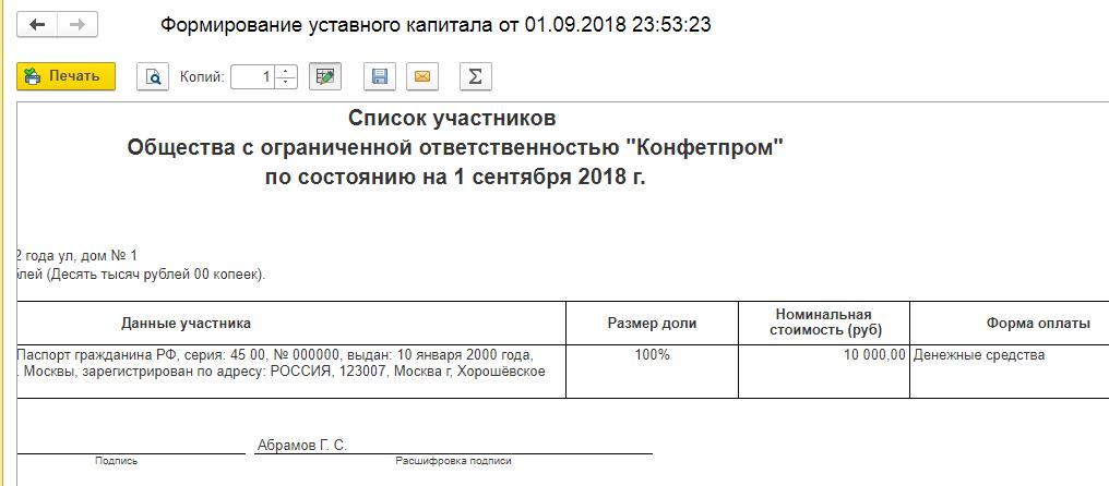 Стоит отметить, что вышеуказанный документ формирования дает возможность напечатать список учредителей, где будут отражены следующие данные: