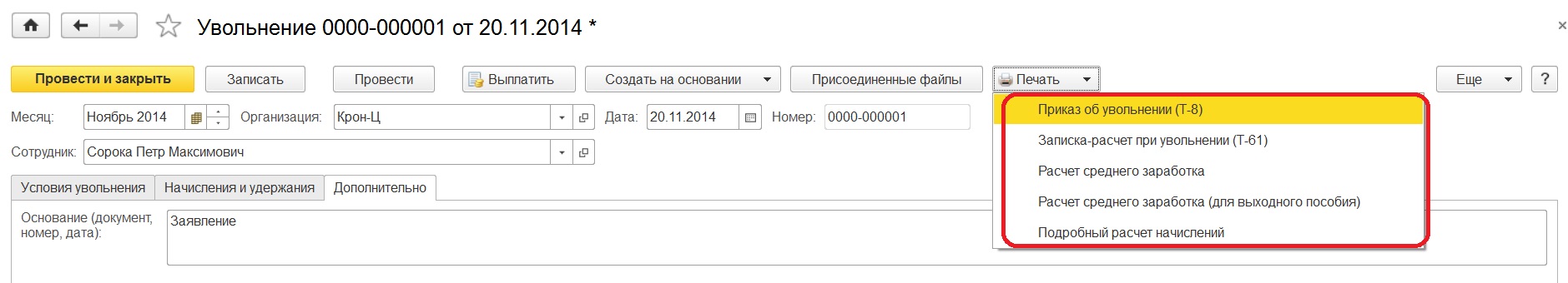 В итоге проводится документ, а сотрудник считается официально уволенным. Специалист может использовать печатные формы, предлагаемые документом. Помимо унифицированных форм Т-8 и Т-61 это расчеты начислений и среднего заработка.