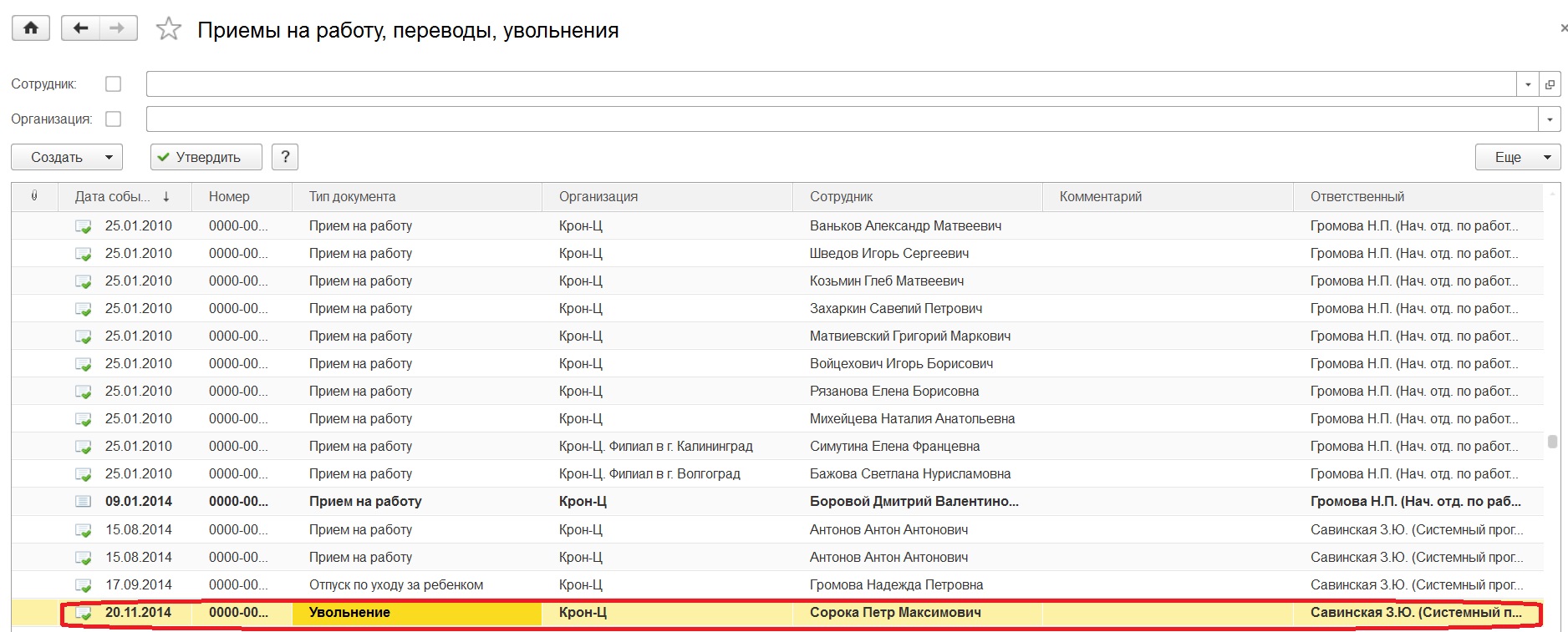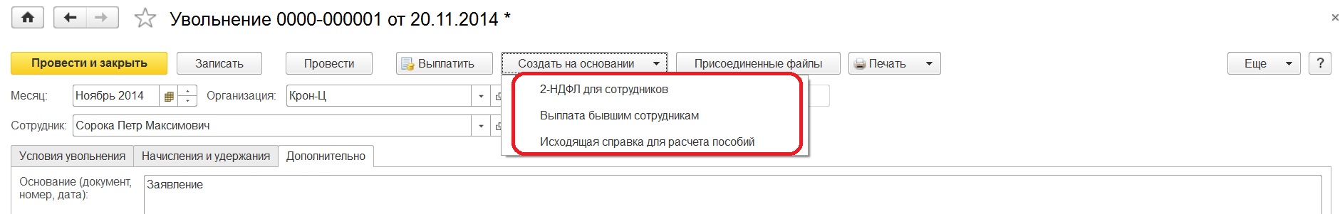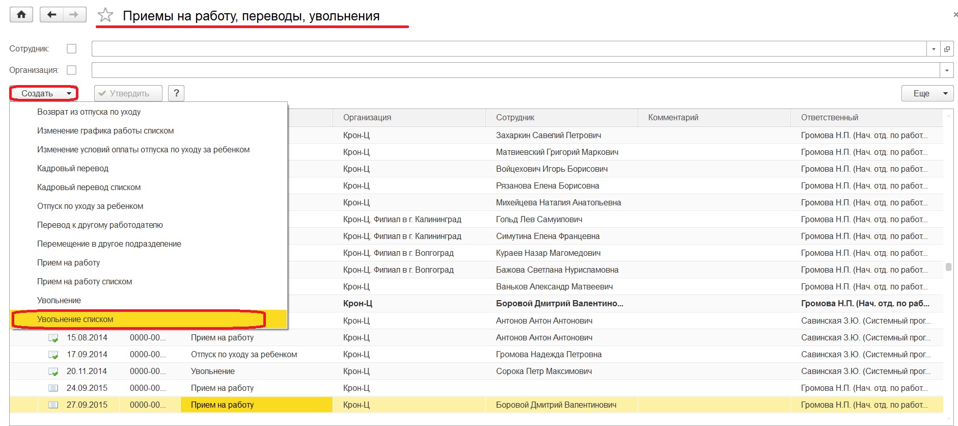 Если возникает потребность в создании группового увольнения, нужно воспользоваться документом из журнала «Приемы, переводы, увольнения». В документе по клавише «Создать» нужно выбрать подходящую позицию.