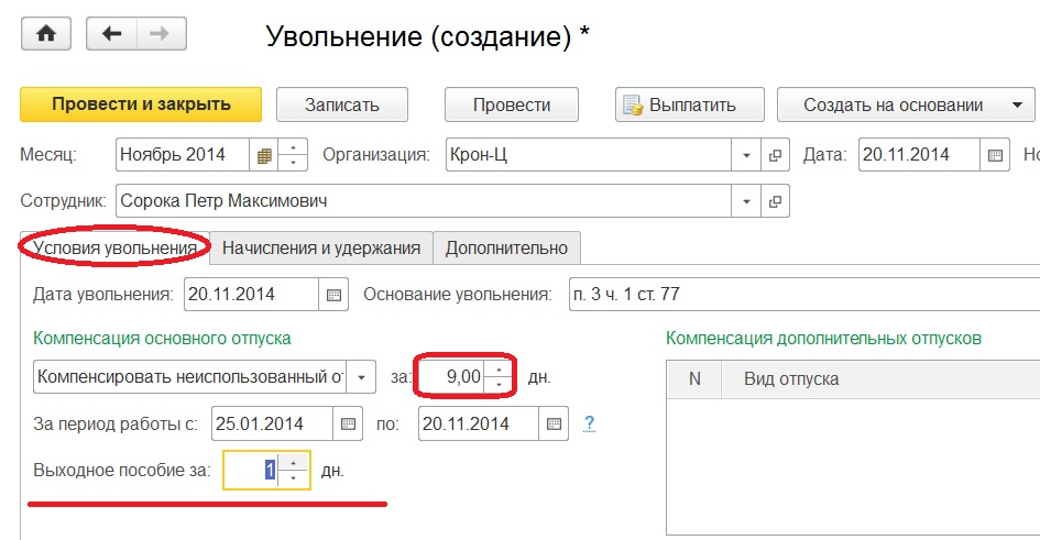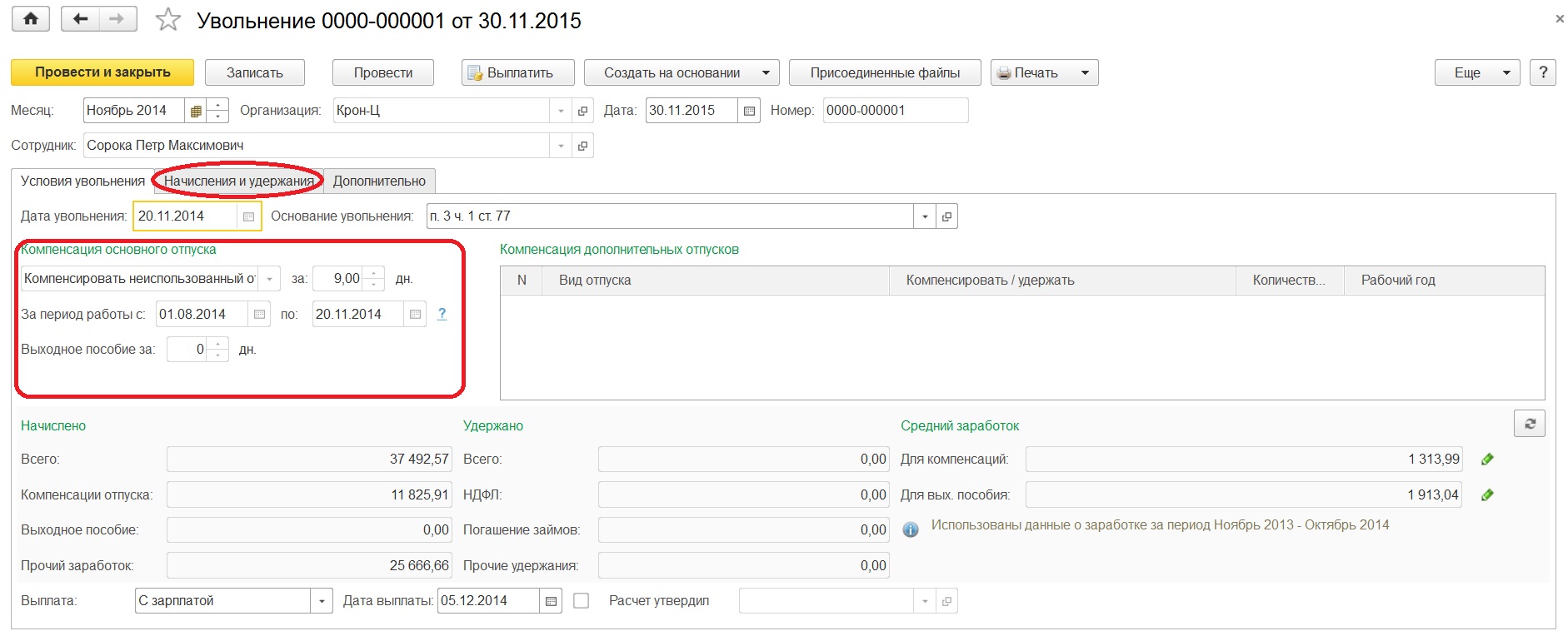 Автоматически программа выделяет одно из действий: «Компенсировать неиспользованный отпуск». Исходя из остатков отпусков, обнаруженных программой, рассчитывается весь блок.