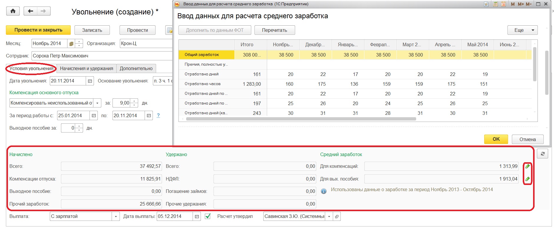 В разделе расчетов предлагается расширенная предлагается расширенная информация по удержаниям и начислениям, которые рассчитываются автоматически после добавления данных. Символ «карандаша» откроет информацию о расчете среднего заработка.