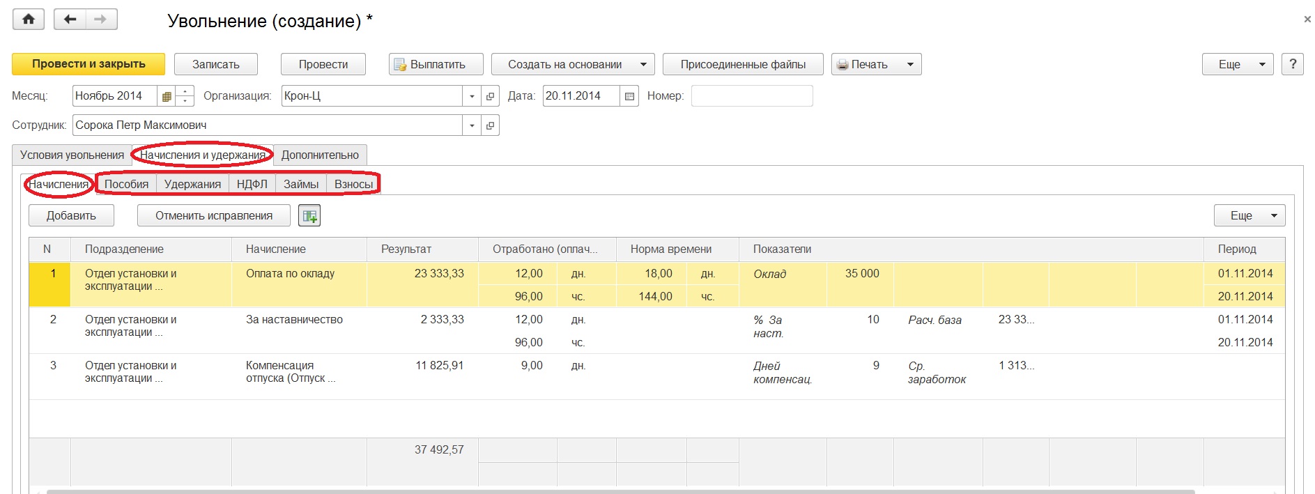 Вкладка «Начисления и удержания» хранит в себе информацию обо всех подобных операциях. Здесь есть еще шесть автоматически заполняемых вкладок.