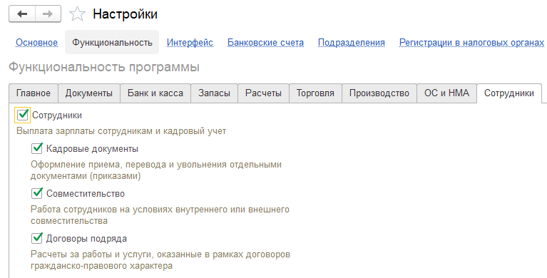 Для активации возможности ведения учета по договорам ГПХ (Договорам подряда) подсистемы «Сотрудники» откройте настройки и войдите по ссылке «Функциональность» в закладку «Сотрудники», установите галочки около логических ключей: