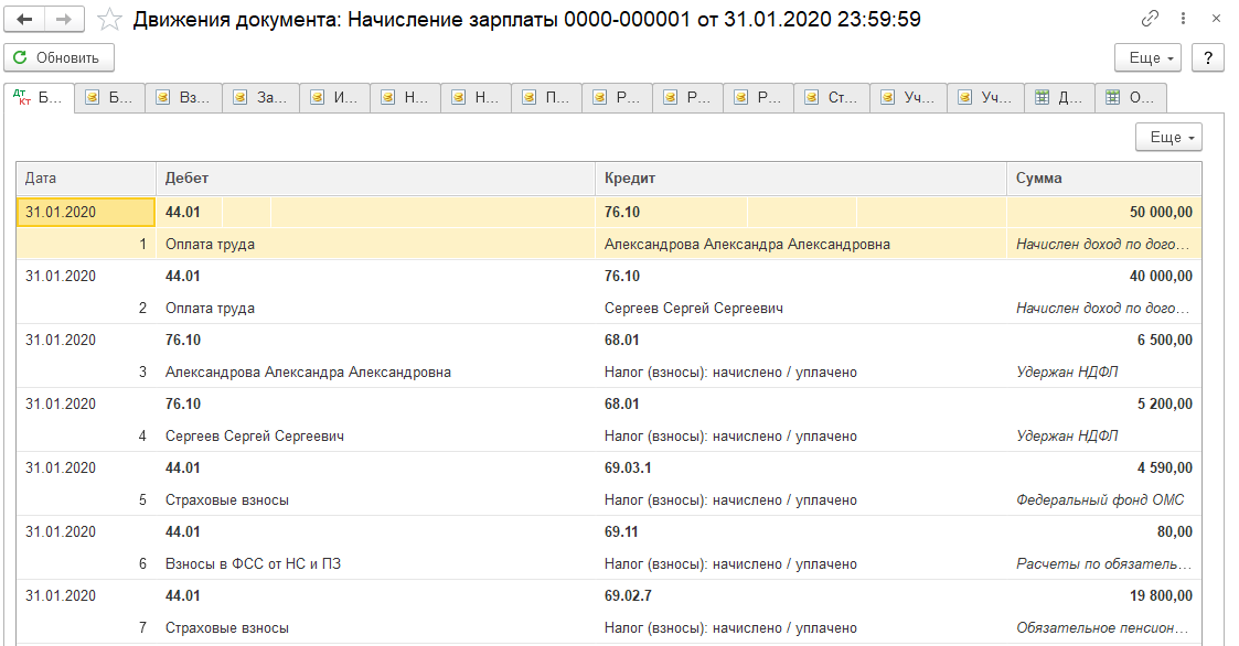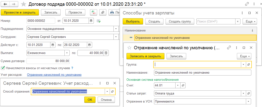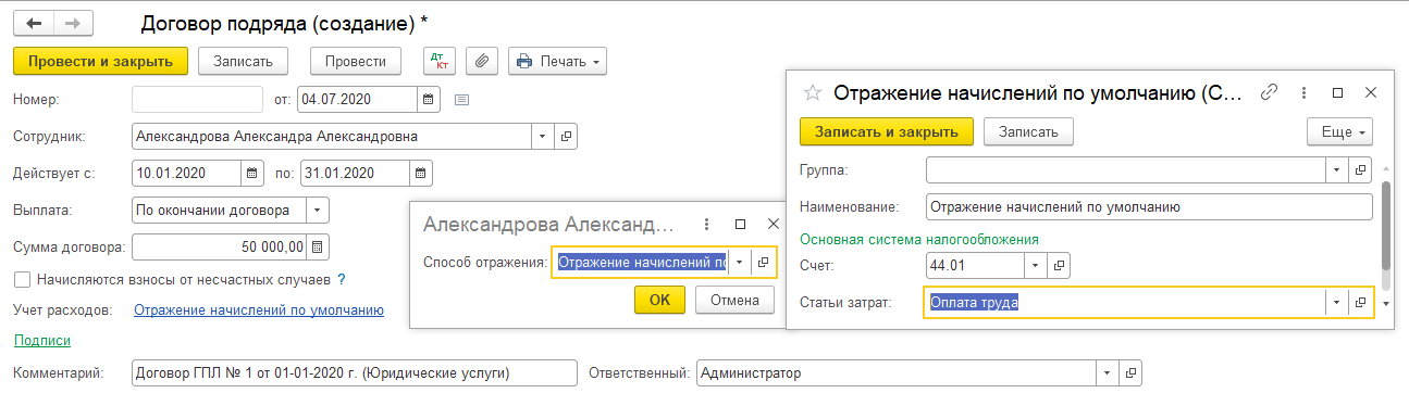 В нашем примере затраты на оплату по договорам ГПХ и связанные с ней отчисления в фонды страхования отнесены на счета затрат 44.01, используемый для учета операций по оплате труда по умолчанию.