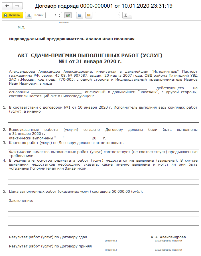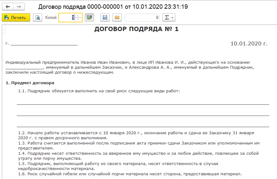 Документ имеет печатные формы Договора и Акта выполненных работ.