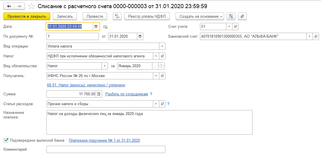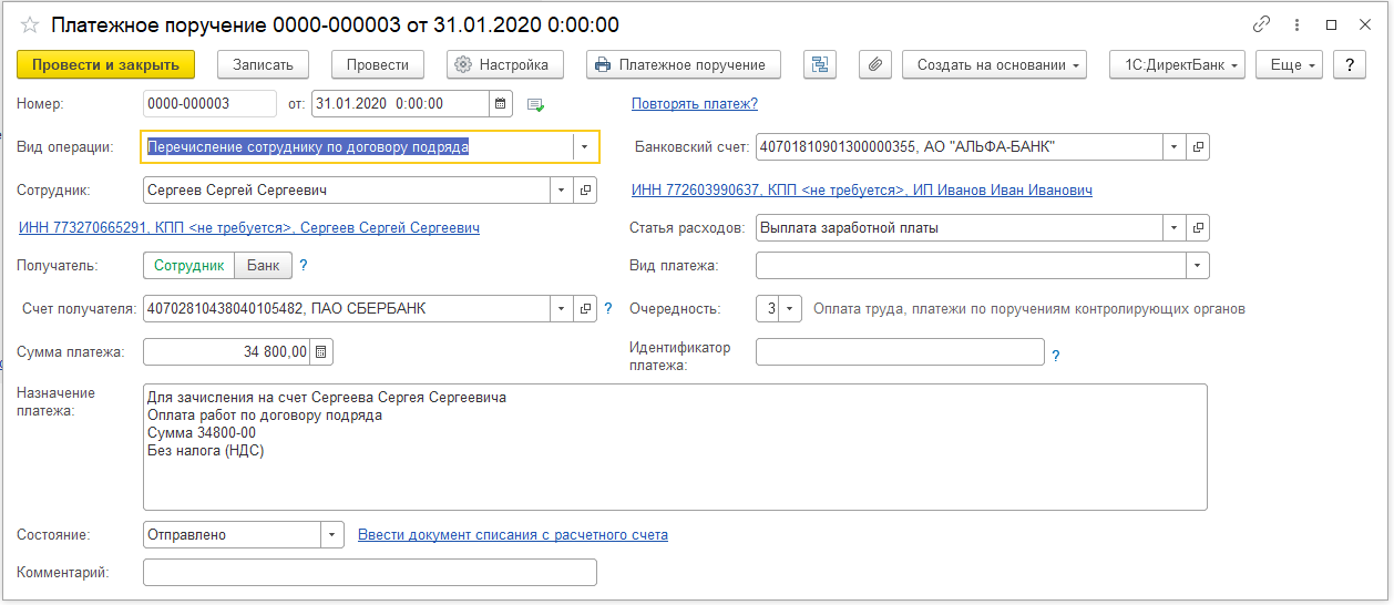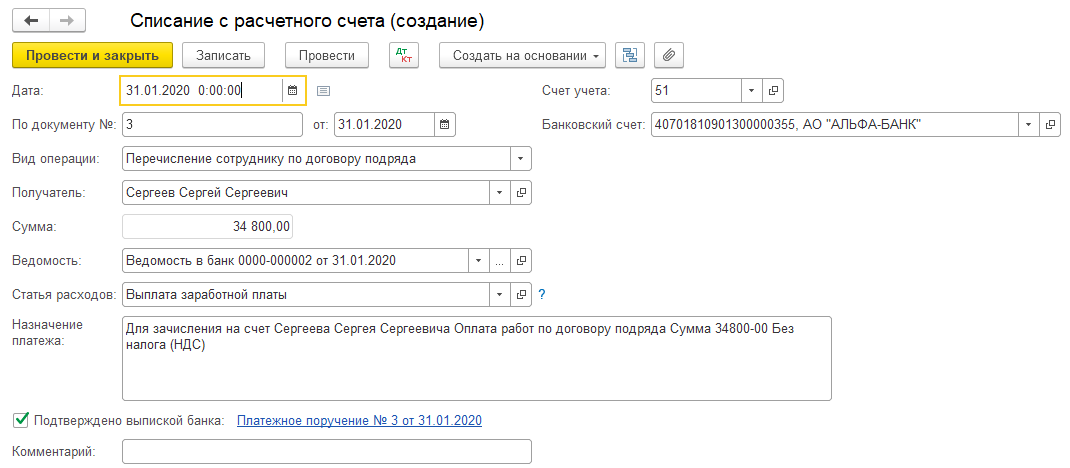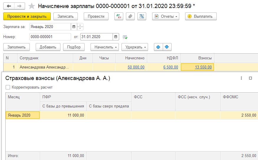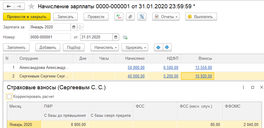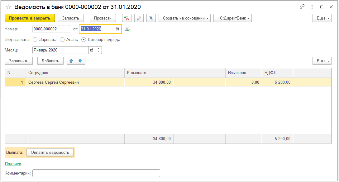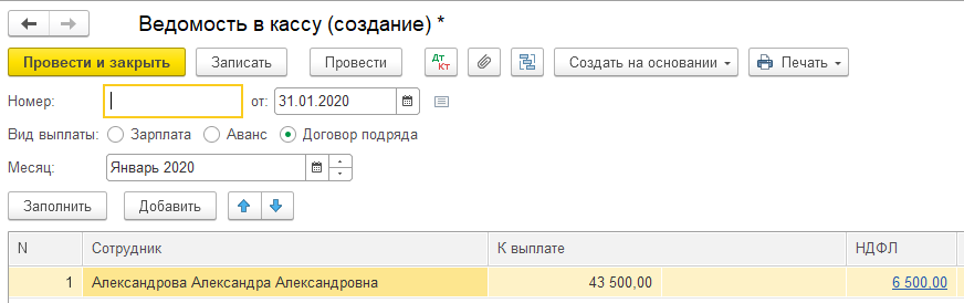 Произведите расчет заплаты, проверьте начисление НДФЛ и взносов с ФОТ (оплата по ГПХ облагается взносами в ПФР и ФСС, но не облагается взносами в ФСС)