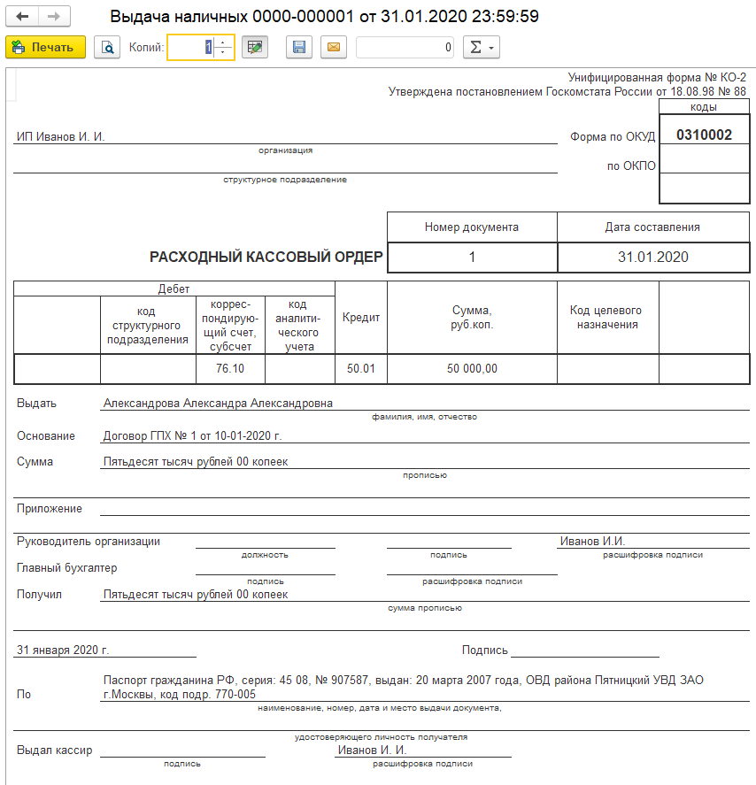 ИП Иванов И.И. заключил с физическим лицом Александровой А.А., не являющимся ИП, договор ГПХ № 1 от 10-01-2020 г. на оказание юридических услуг на сумму 50000 рублей, расчеты производится по окончании договора наличными.
