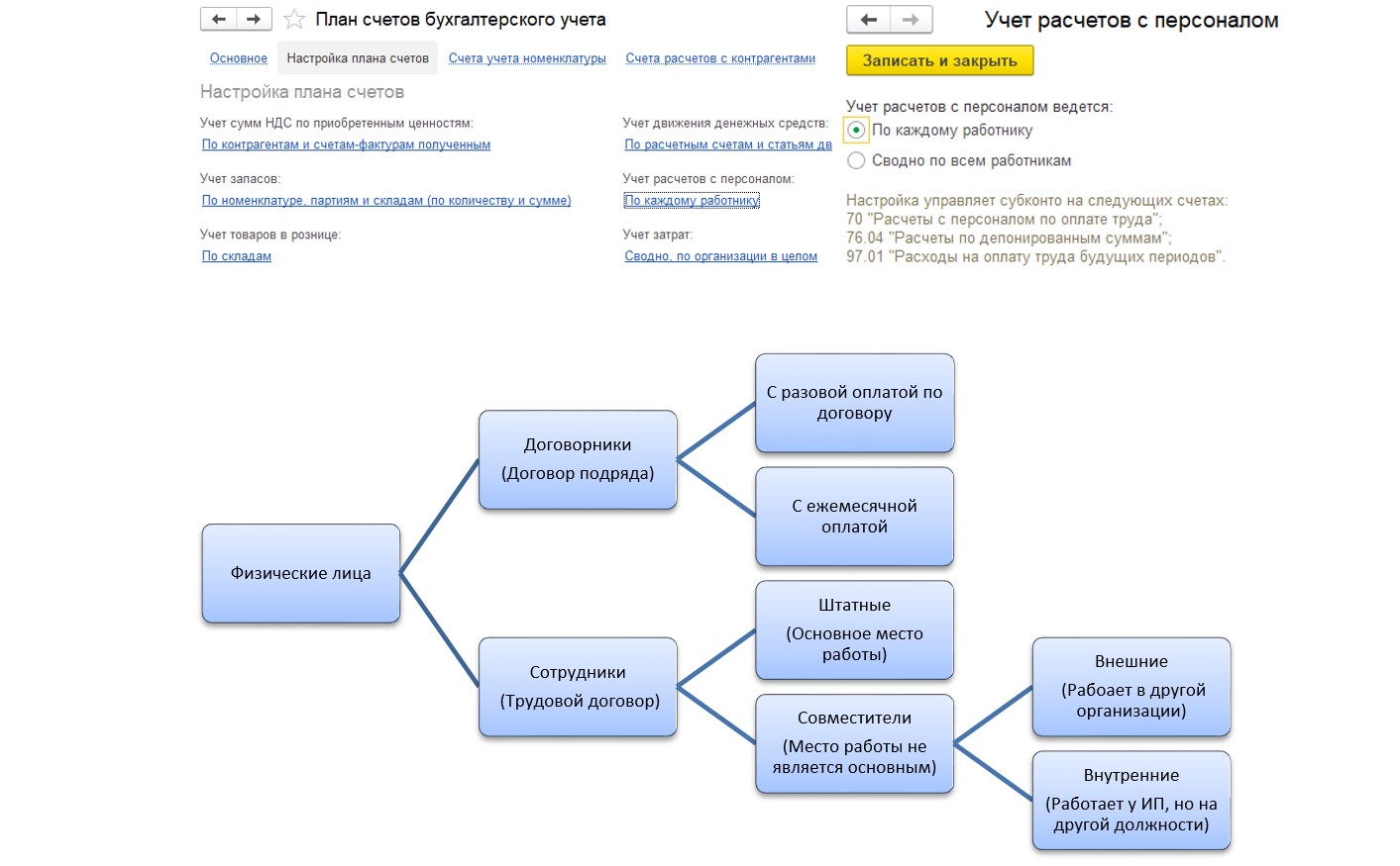 Для обеспечения ведения аналитического учета в разрезе сотрудников должна быть включена специальная настройка Плана счетов:
