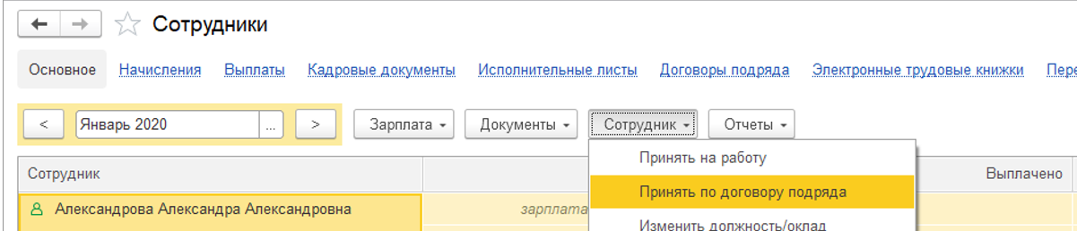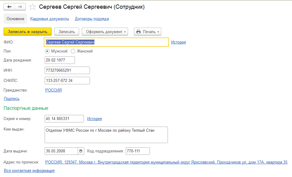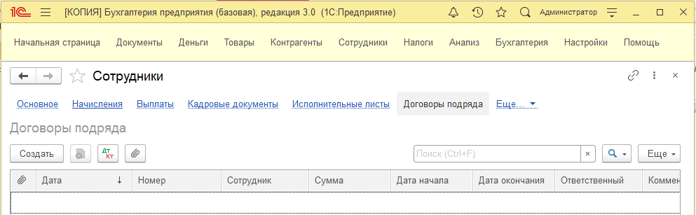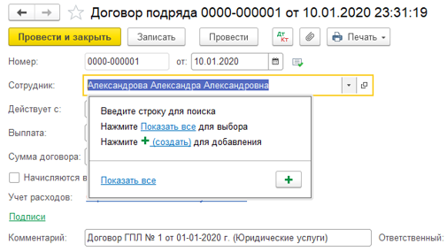• В контексте формы договора создайте запись об исполнителе ГПД в справочнике «Сотрудники» (Кнопка «+Создать»)