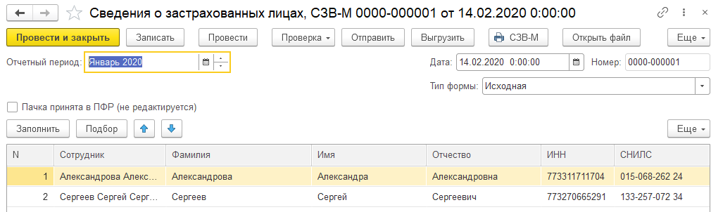 Поскольку, физические лица Александрова и Серов в январе месяце имели доходы, облагаемые страховыми взносами в ПФР, необходимо подготовить и сдать в срок до 15 февраля отчет по форме СЗВ-М (Сведения о застрахованных лицах) в органы пенсионного фонда.