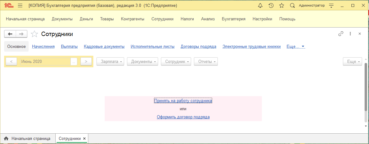 Ключ «Сотрудники» активирует возможности программы по начислению и выплате заработной платы и ведению кадрового учета