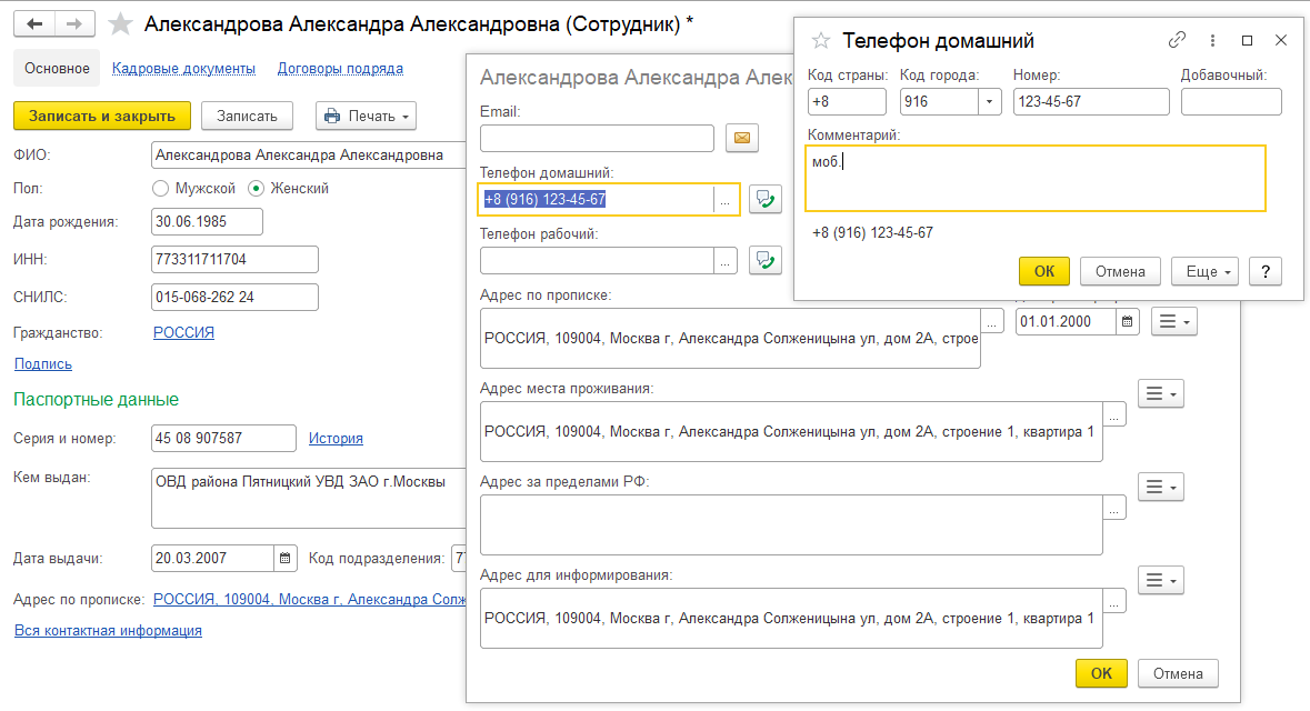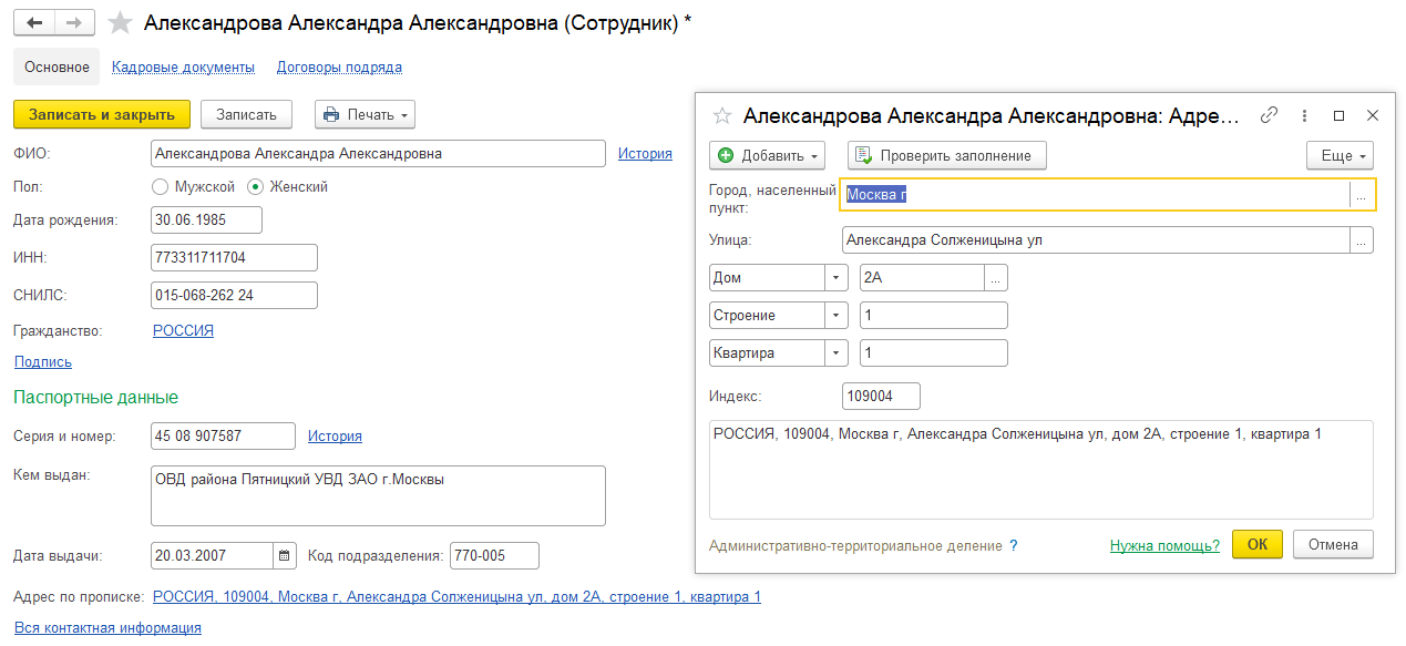 • Заполните персональные данные Александровой А.А., Адрес по прописке введите через специальную форму, используя классификатор адресов КЛАДР.