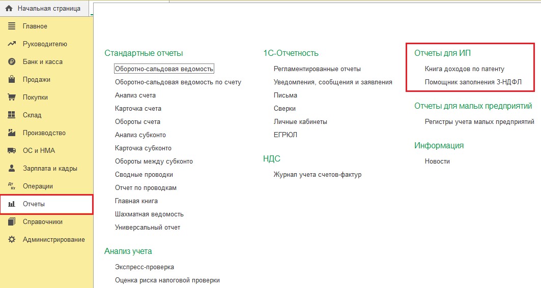В разделе «Отчёты» установлено автоматического типа создание книги доходов по патенту, а еще присутствует помощник заполнения 3-НДФЛ.