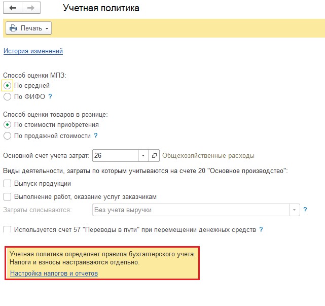 Внизу окошка «Учётная политика» есть переход на настройку УП для целей налогового учёта – «Настройка налогов и отчётности». Так же её можно открыть во вкладке «Главное» - «Налоги и отчёты».