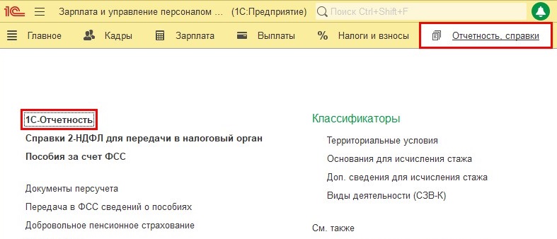 Шаг 1. Для формирования отчёта «Расчёт по страховым взносам» перейдите в раздел «Отчётность, справки», затем нажмите «1С-Отчетность» (для 1С: ЗУП).