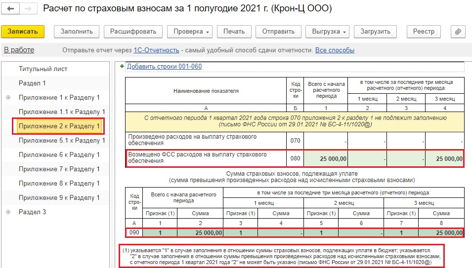 Обычно с Приложением 2 к Разделу 1 вопросов нет. В строке 080 «Возмещено ФСС расходов на выплату страхового обеспечения» отражена сумма полученного от ФСС возмещения.