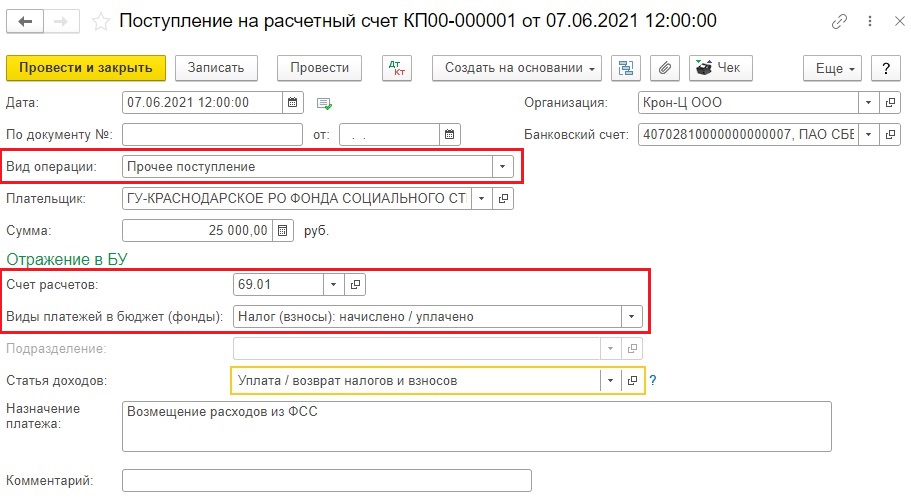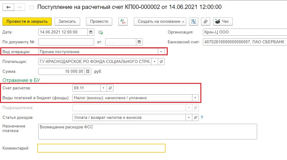 В программе 1С: Бухгалтерия предприятия регистрация денежных средств, поступивших от ФСС, производится документом «Поступление на расчётный счёт» в разделе «Банк и касса».