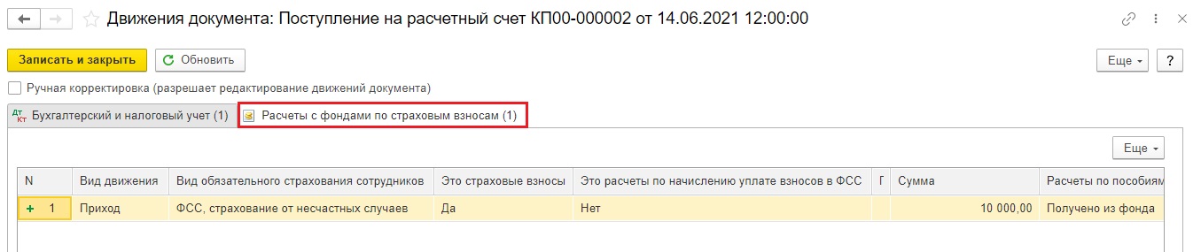 В документе задействован регистр накопления «Расчёты с фондами по страховым взносам».