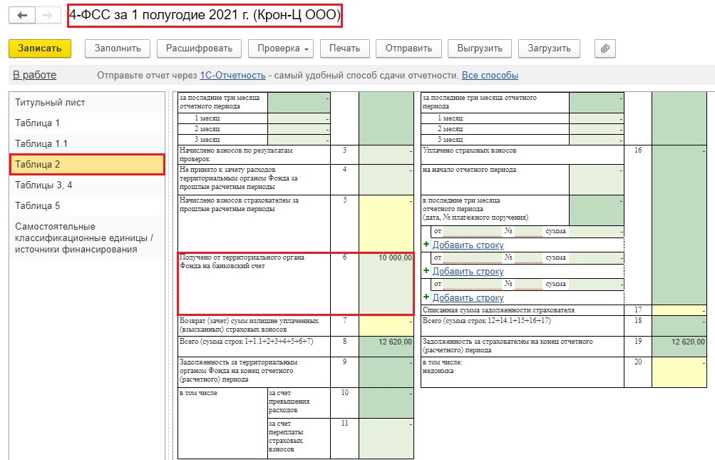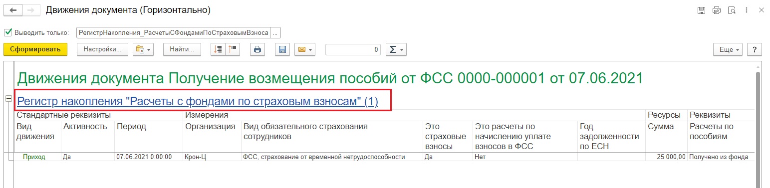Просмотрим как отразится сумма, полученная от ФСС в счёт возмещения пособий, в отчётности.