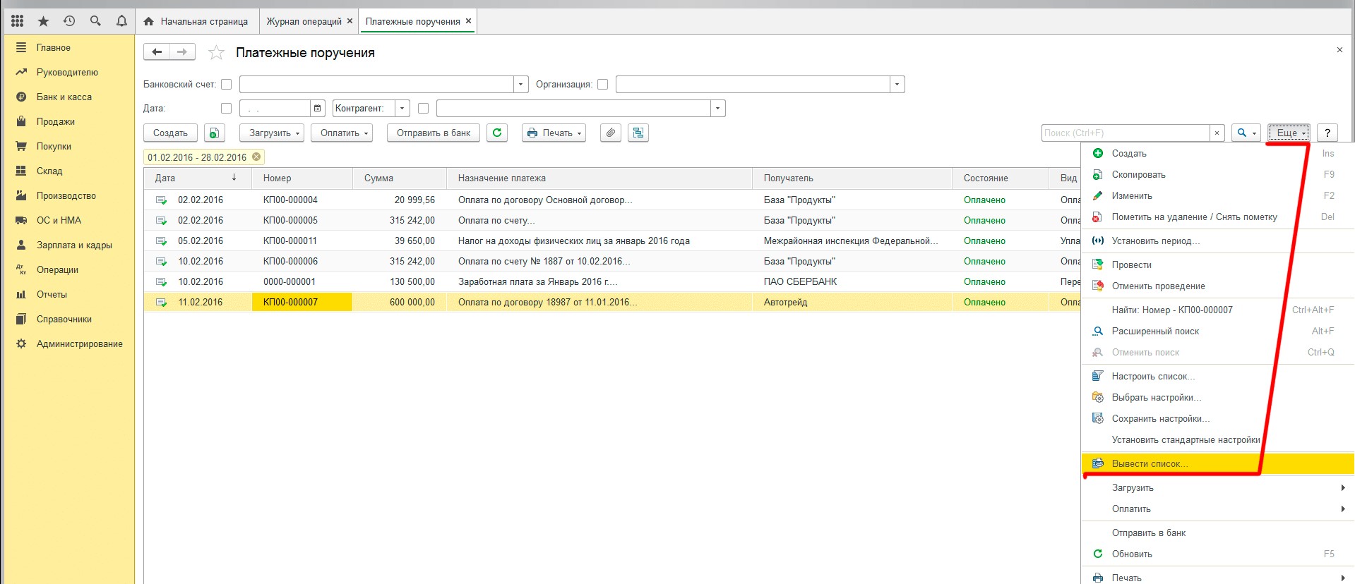 Пример. Список платежных поручений. Для того, чтобы его выгрузить, необходимо в верхнем правом углу кликнуть по кнопке «Еще» и выбрать функцию «Вывести список».