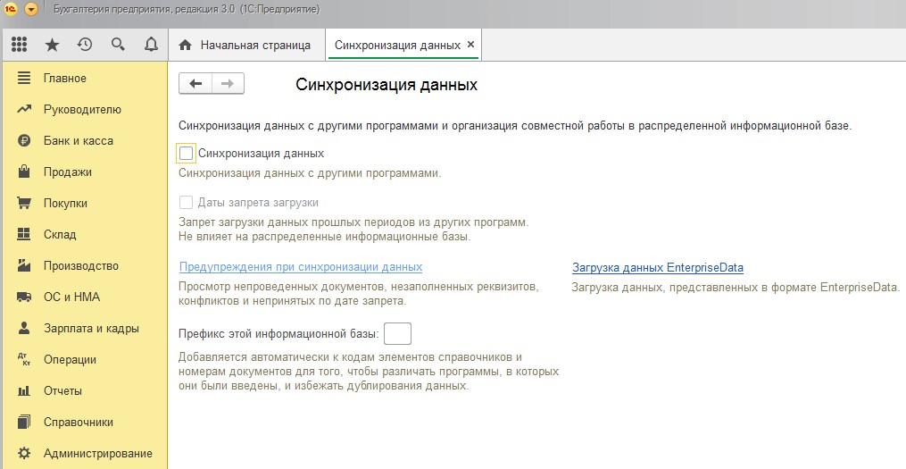 Синхронизация данных – это возможность совершать обмен данными между программами 1С. Для того, что активировать эту функцию, необходимо в меню «Администрирование», включить «Синхронизацию данных»